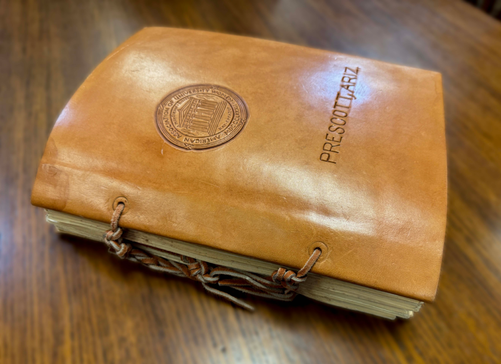 The AAUW Prescott Archive Committee has uncovered a trove of information about our Prescott Branch founders, and we are working to preserve this collection for future historians: of AAUW Prescott, of Prescott, or history and culture in general. Our objective is to enhance the details we have of prior AAUW-Prescott Leaders, and, in some cases, rehabilitate the versions implied by very bad newspaper photos and scant recorded information. Along the way, we are having fun discovering illuminating and fun information about our Branch, beginning in 1949. This photo shows the First leather-bound scrapbook from our Bransh now archived in the Sharlot Hall Museum Research Center.